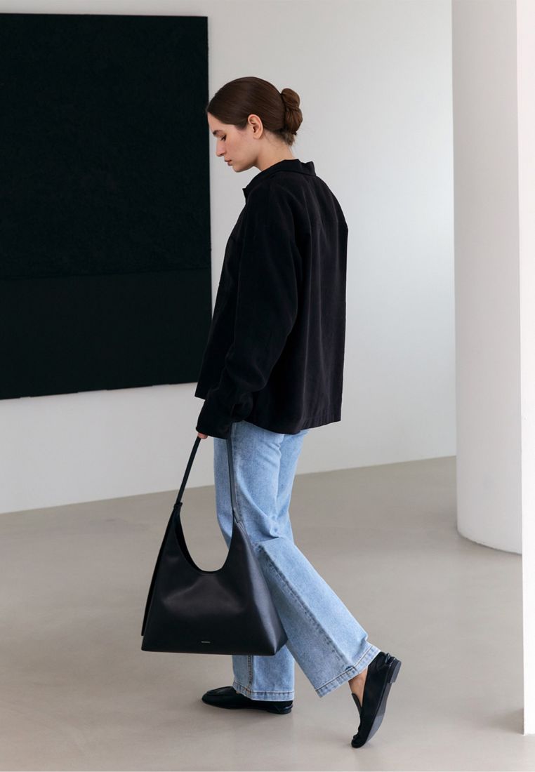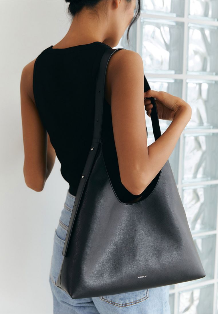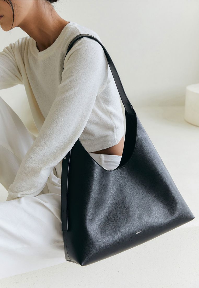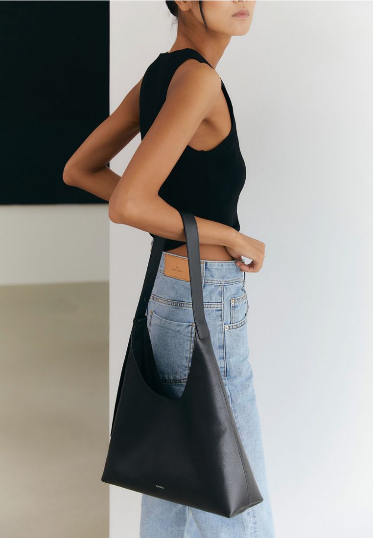 This shoulder bag has a simple yet chic design that combines straight and curved lines in a triangular silhouette.