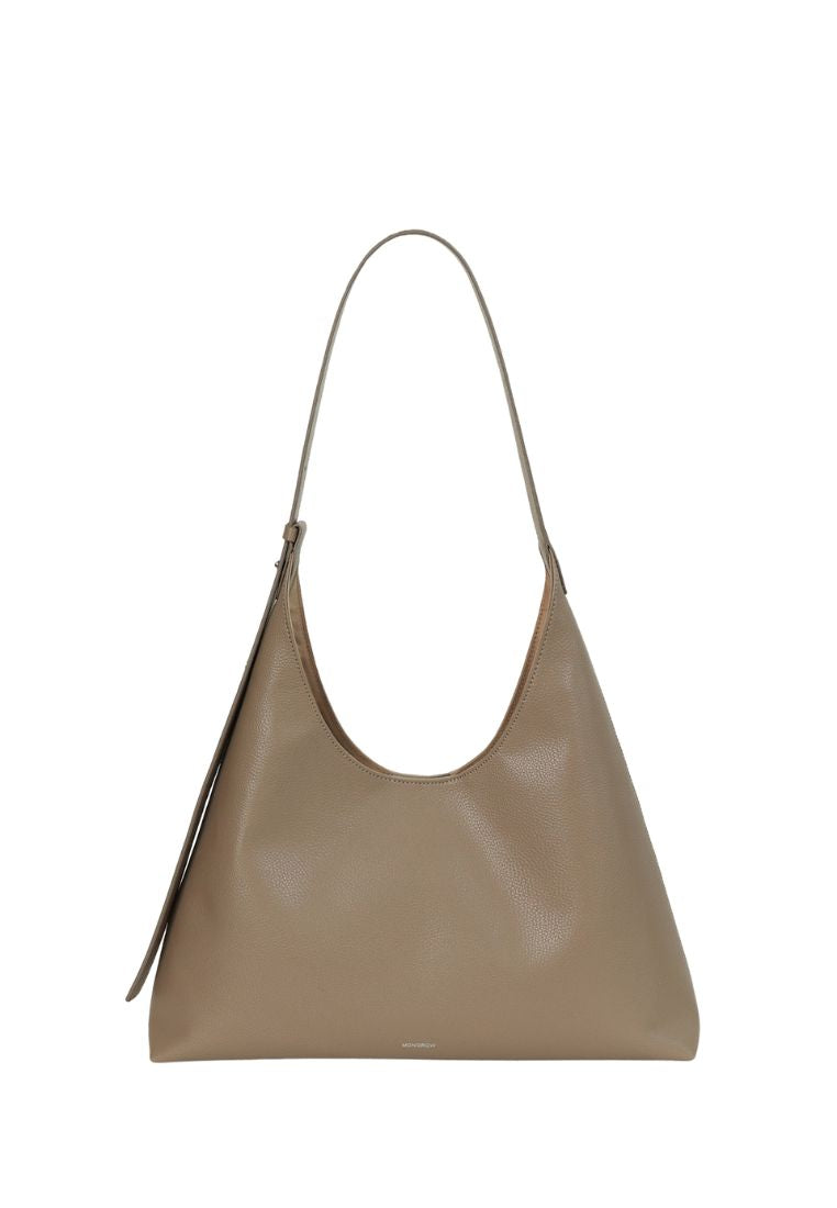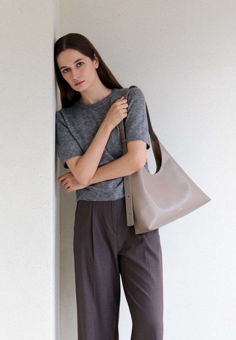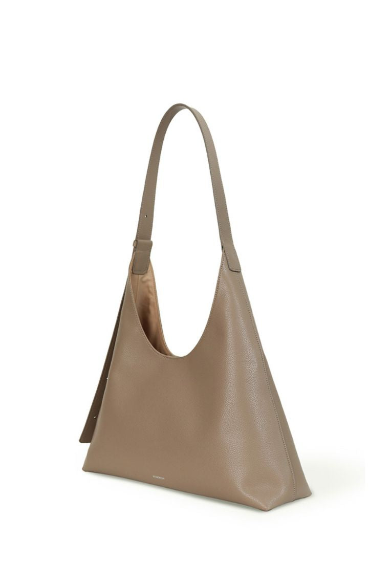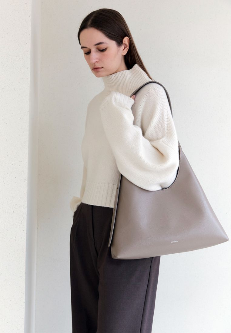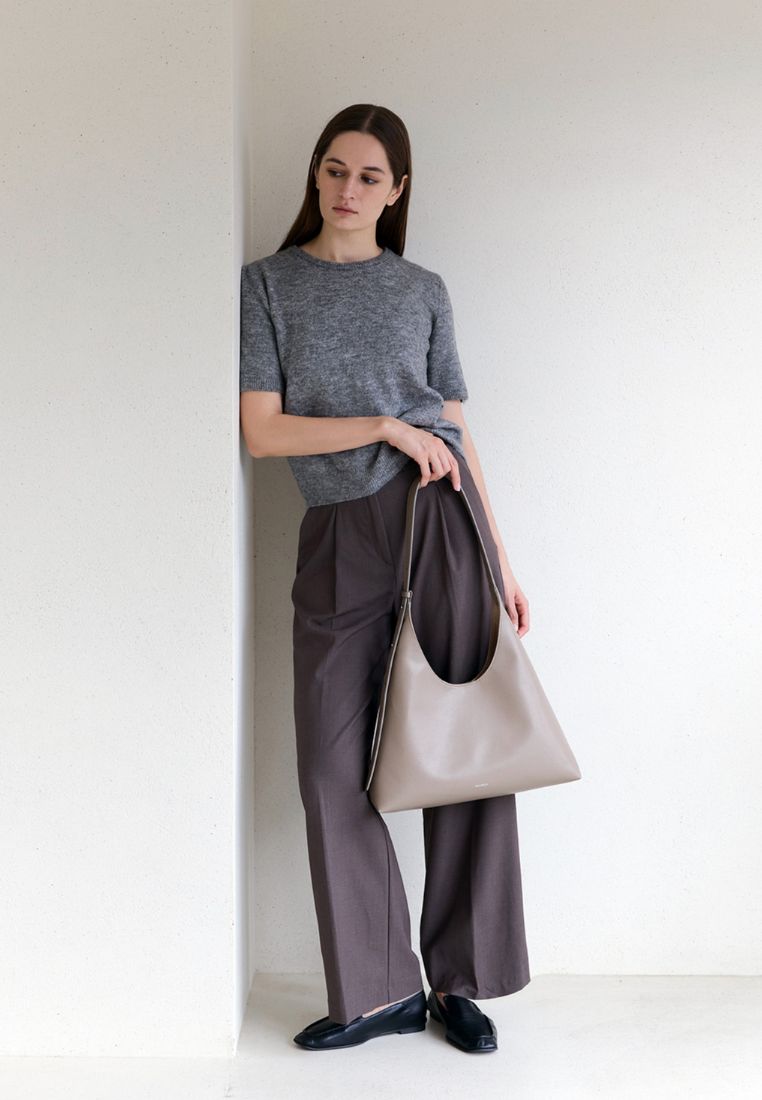 This shoulder bag has a simple yet chic design that combines straight and curved lines in a triangular silhouette.