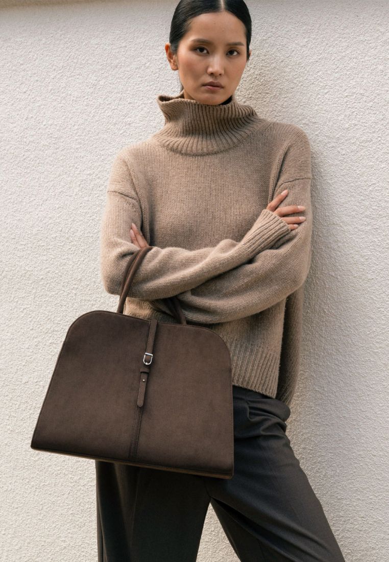 \nThis is an oversized tote bag with a soft shape and wide design. It is a big bag characterized by its simplicity with a slim belt decoration and its lightness of 500g.