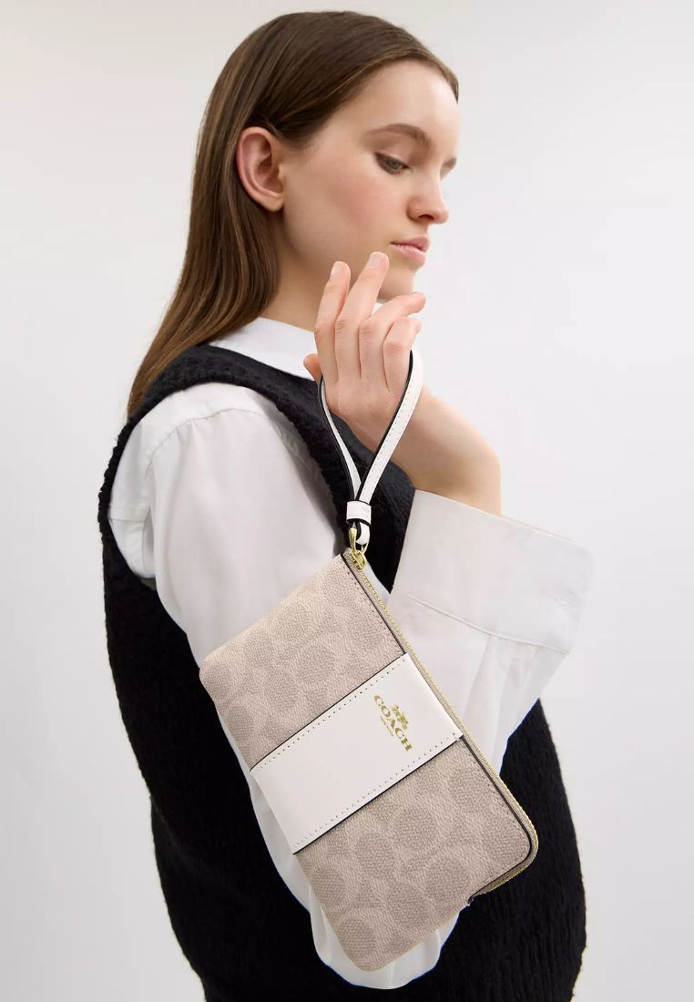 Corner Zip Wristlet In Signature Canvas With Stripe Gold Sand Chalk