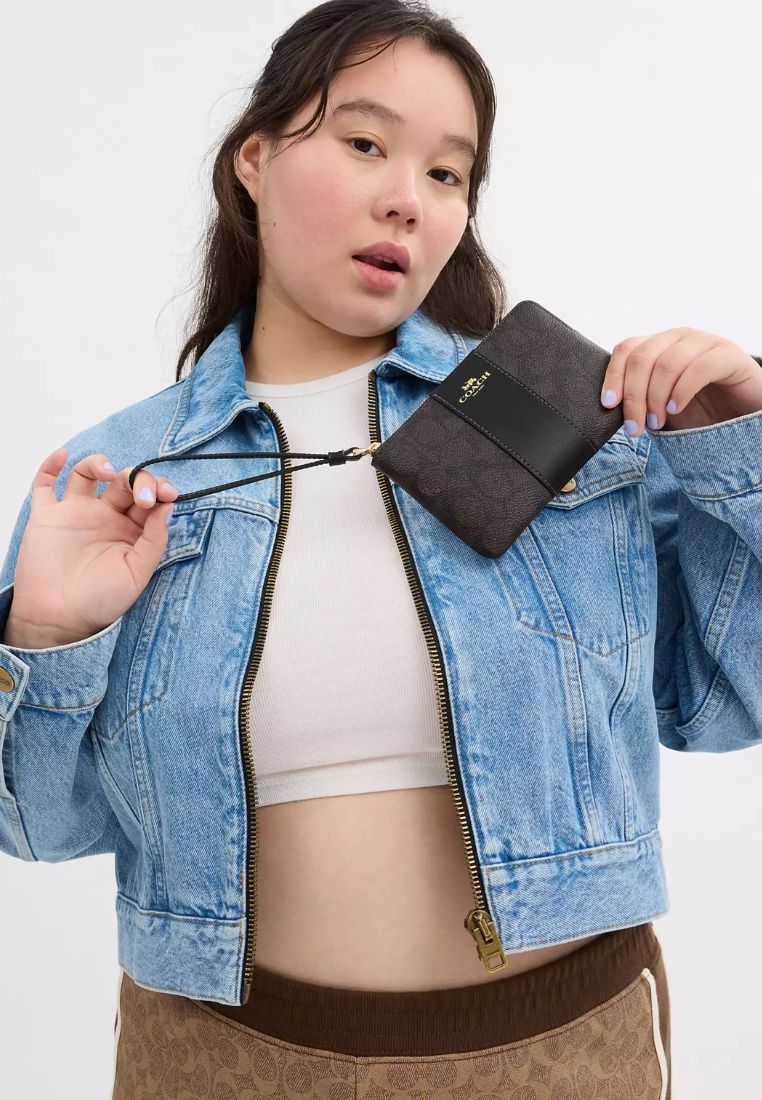 Corner Zip Wristlet In Signature Canvas With Stripe Gold Walnut Black