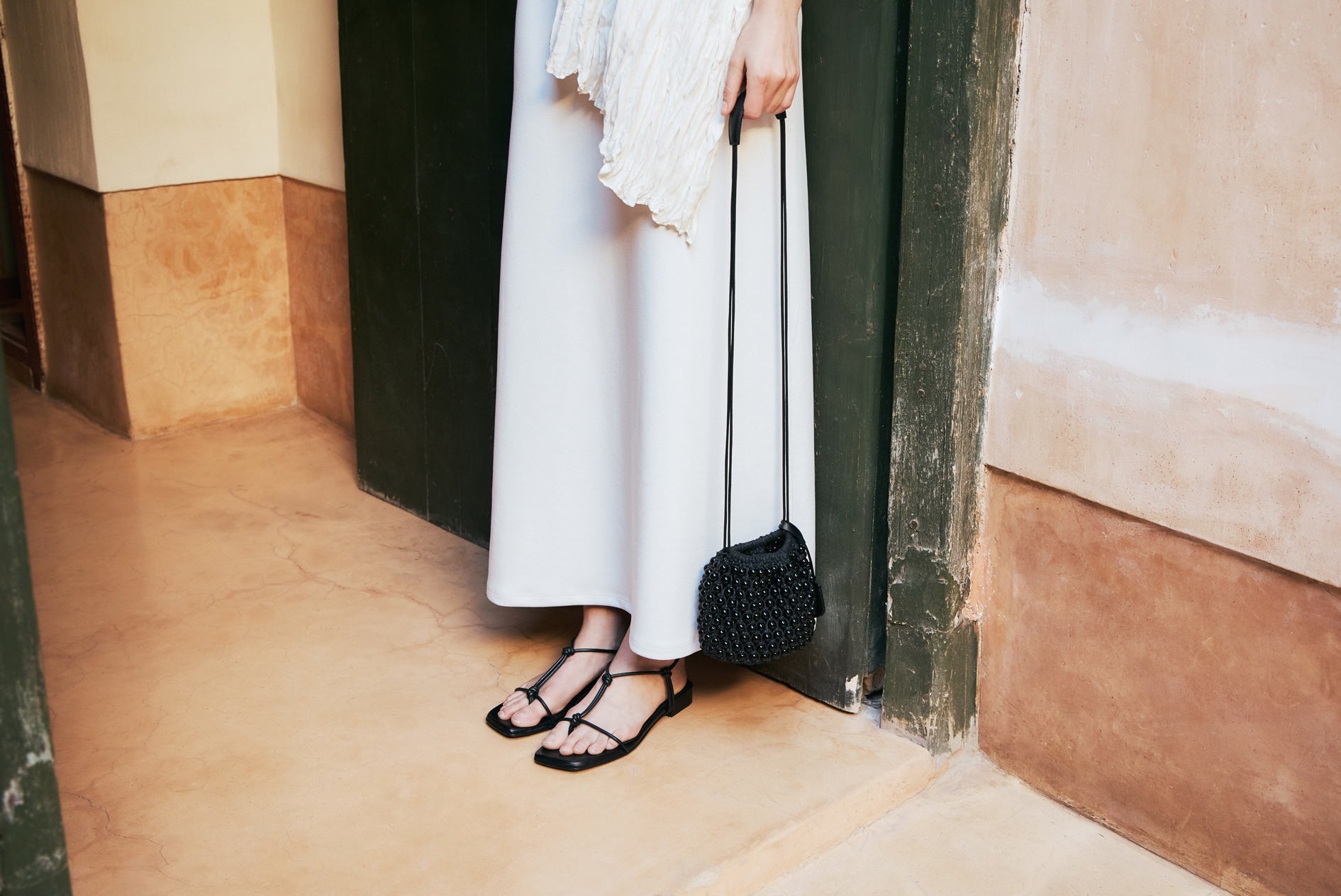 The Corda sandal is a harmonious combination of a minimal silhouette that makes use of space and knot details. The curved strap line that flows gently along the instep and the knot created by connecting the straps create a simple yet beautiful silhouette. The angular outsole line with a square toe shape emphasizes a modern mood, and the points of the knot and the lines of the straps as planes form the design's point, line, and plane elements. The light weight derived from the simple structure and the design through delicate calculations provide a comfortable yet stable fit. The heel height is about 1.5 cm, and we recommend purchasing the regular size.