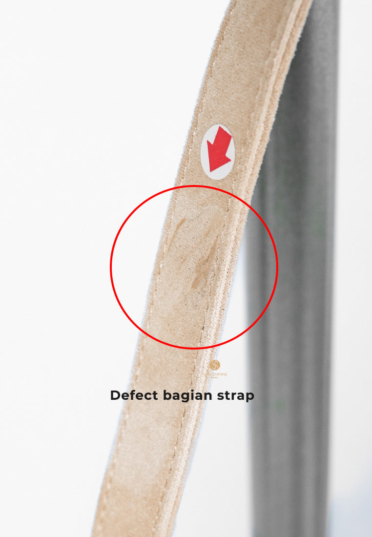 Keterangan defect: ada bagian yang mengeras di bagian strap suede