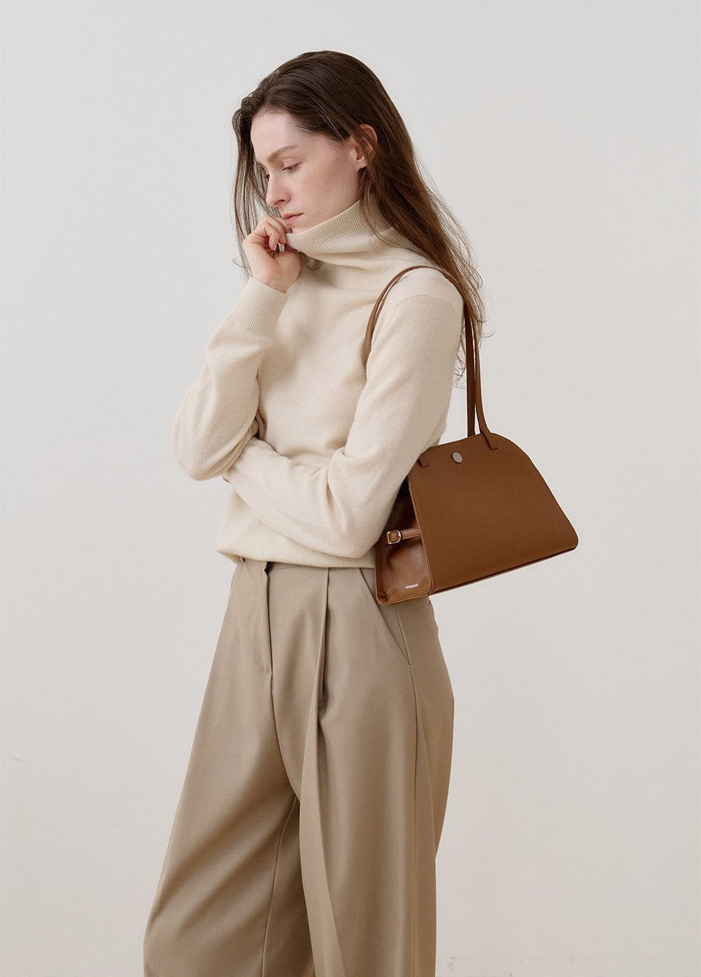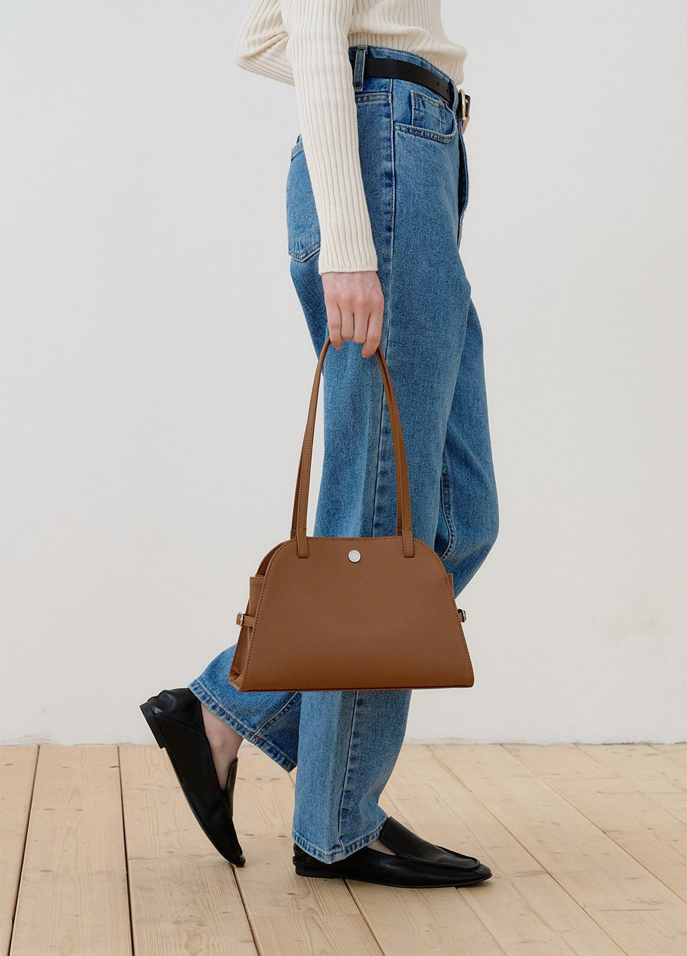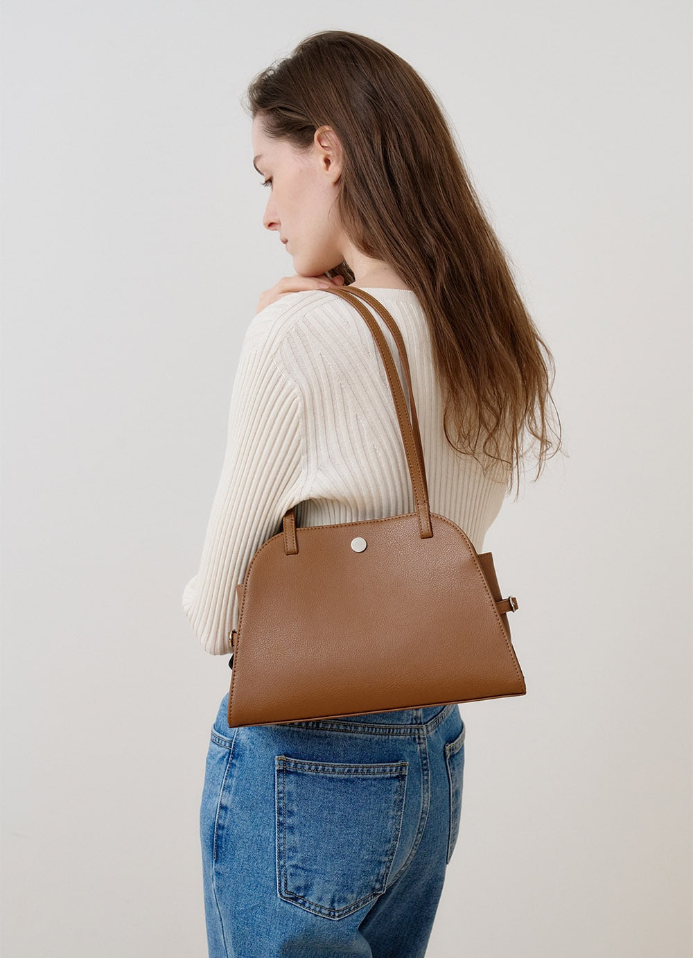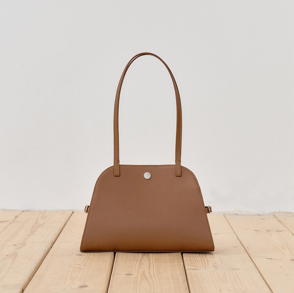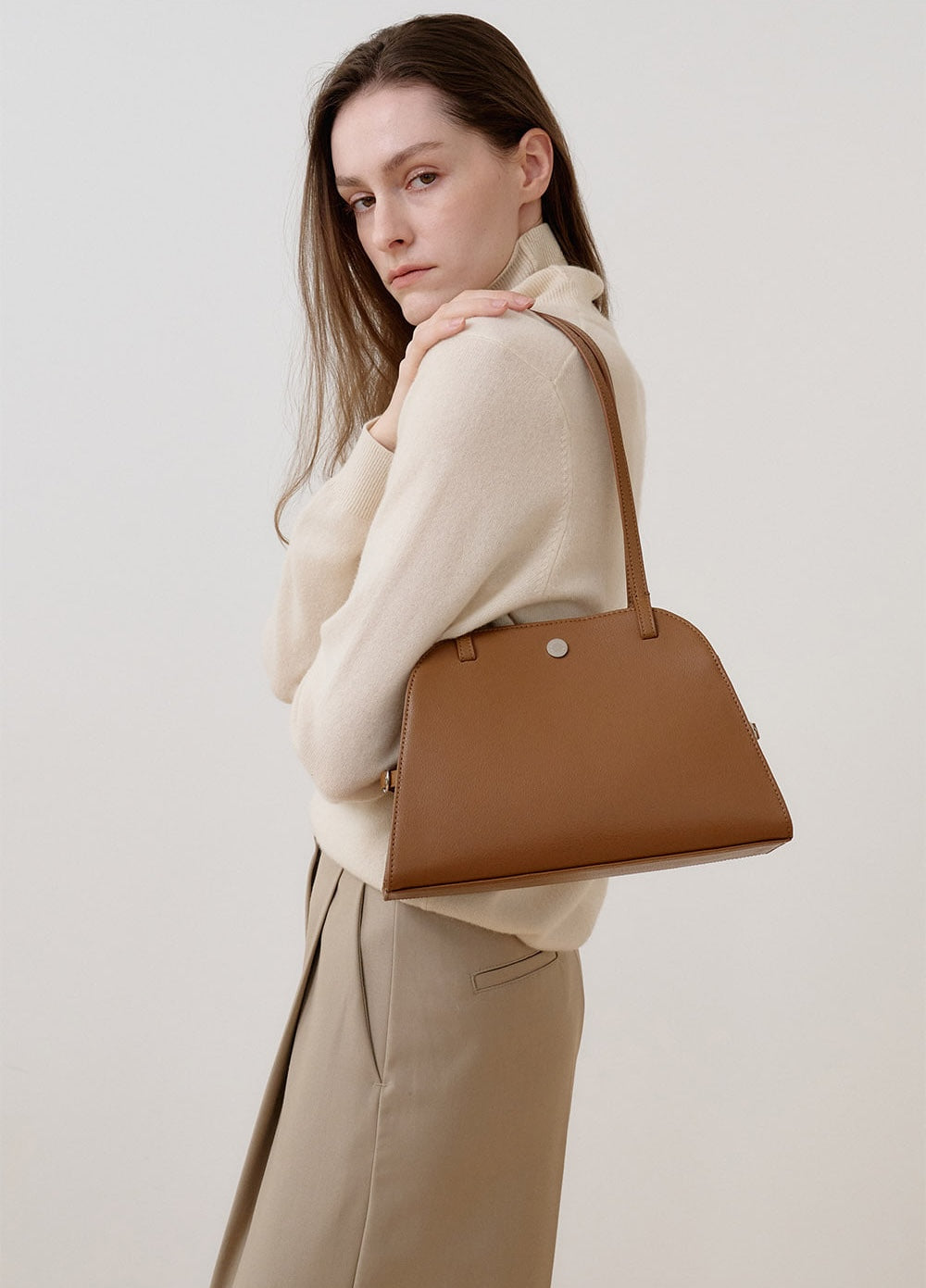 This is a sophisticated shoulder bag with a harmonious blend of soft curves and straight lines. Its basic design, combined with a comfortably long strap, enhances wearability, while minimal metal accents complete a sleek, polished look. The magnetic closure allows for easy and neat opening and closing, making it highly practical for everyday use.