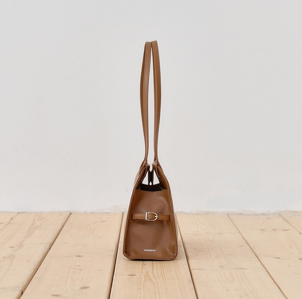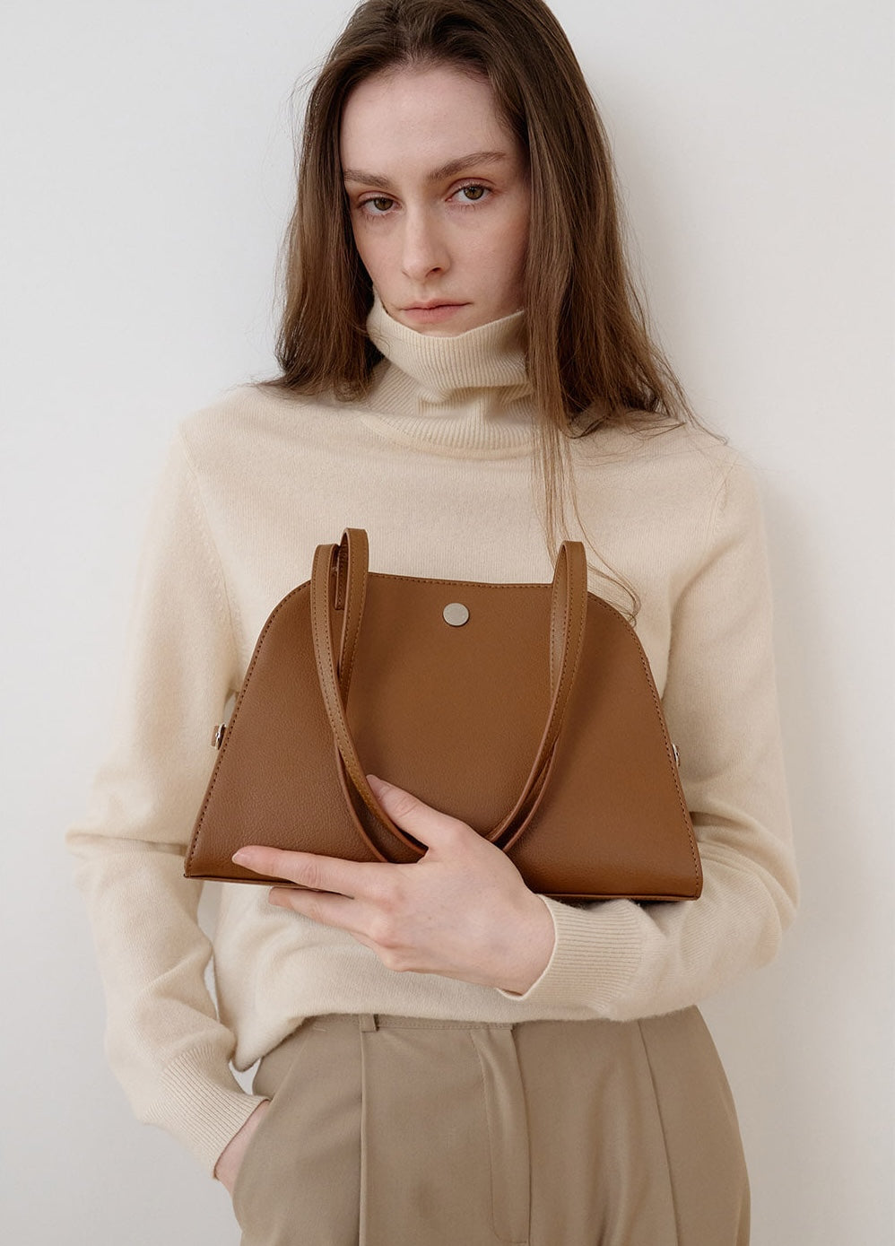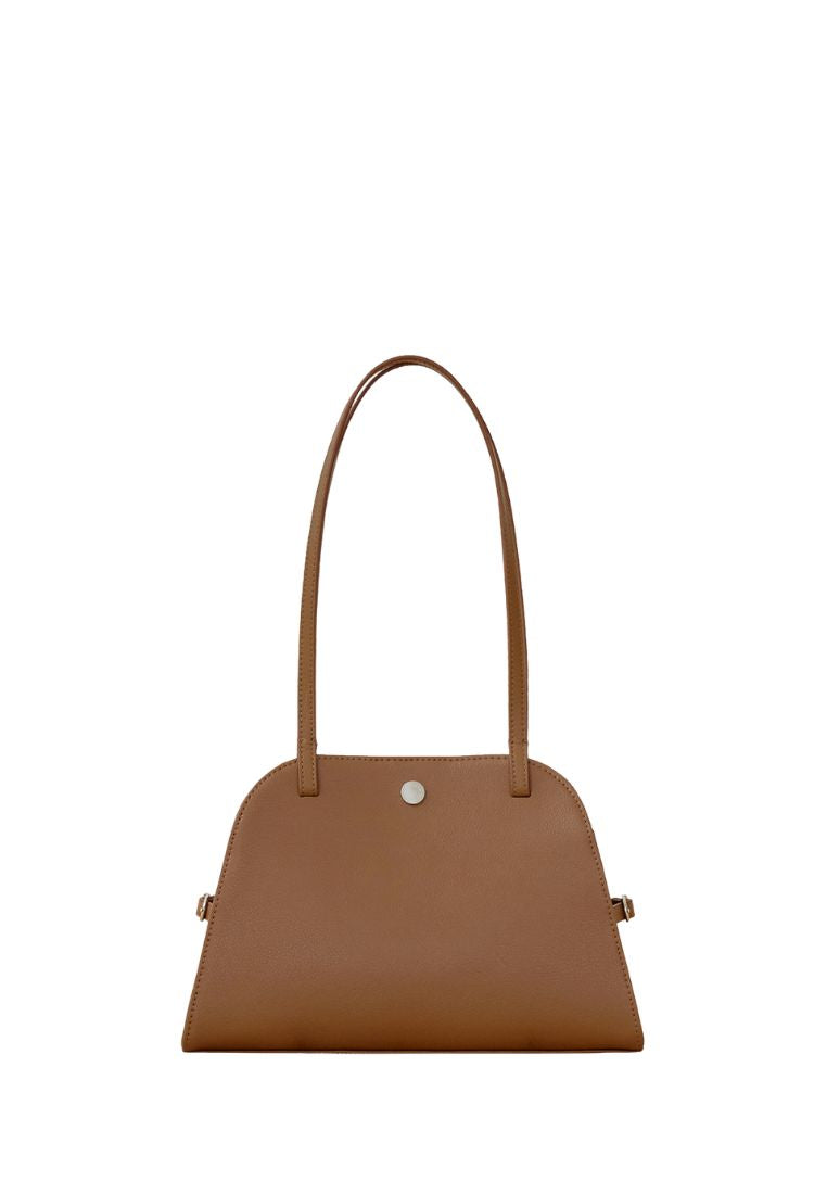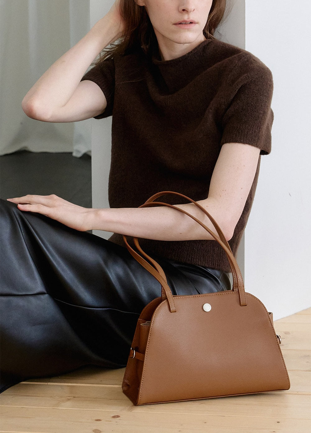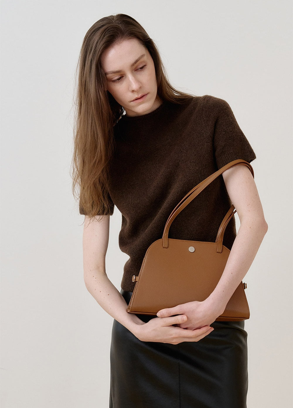 This is a sophisticated shoulder bag with a harmonious blend of soft curves and straight lines. Its basic design, combined with a comfortably long strap, enhances wearability, while minimal metal accents complete a sleek, polished look. The magnetic closure allows for easy and neat opening and closing, making it highly practical for everyday use.