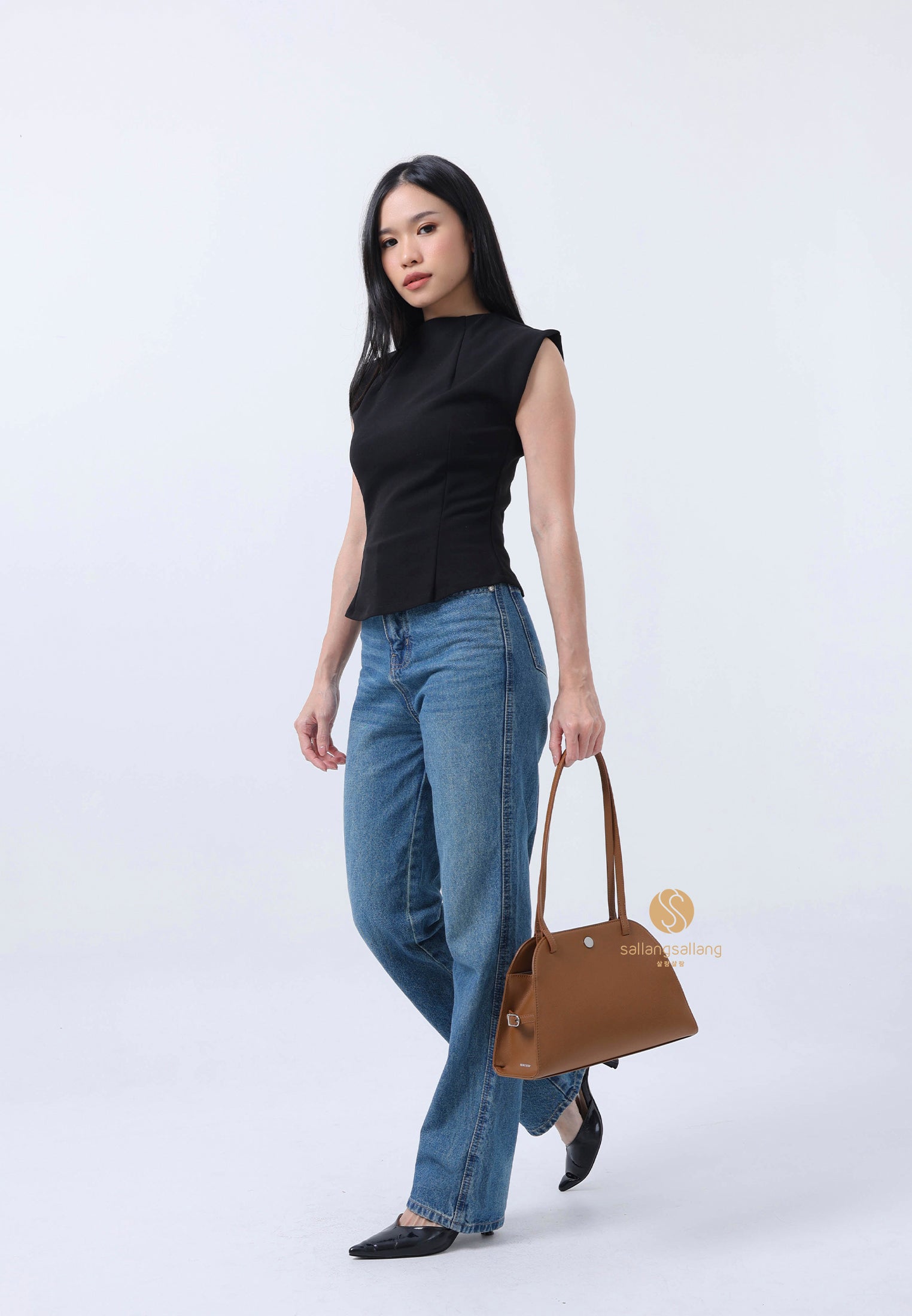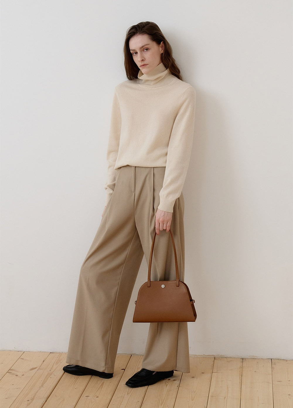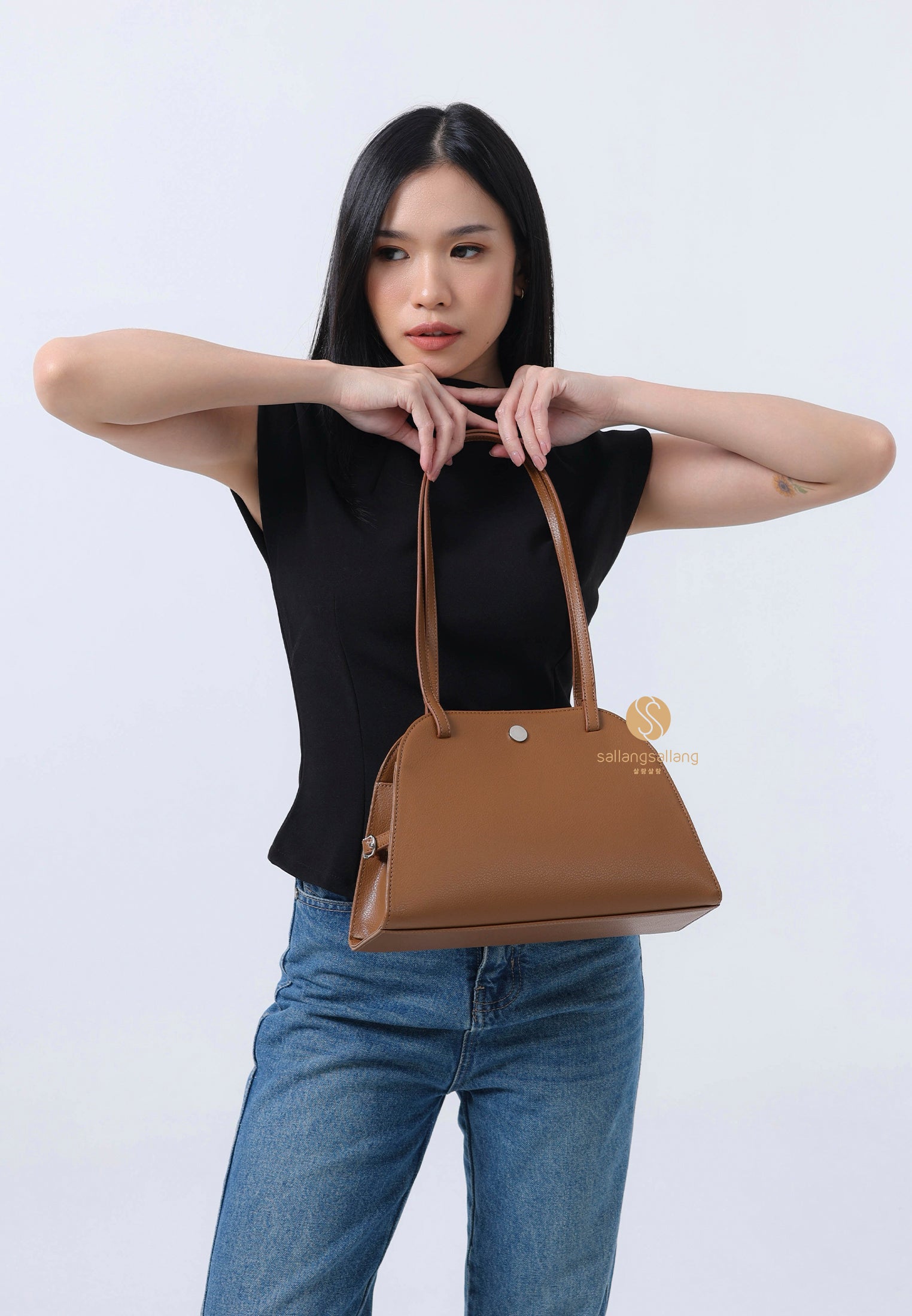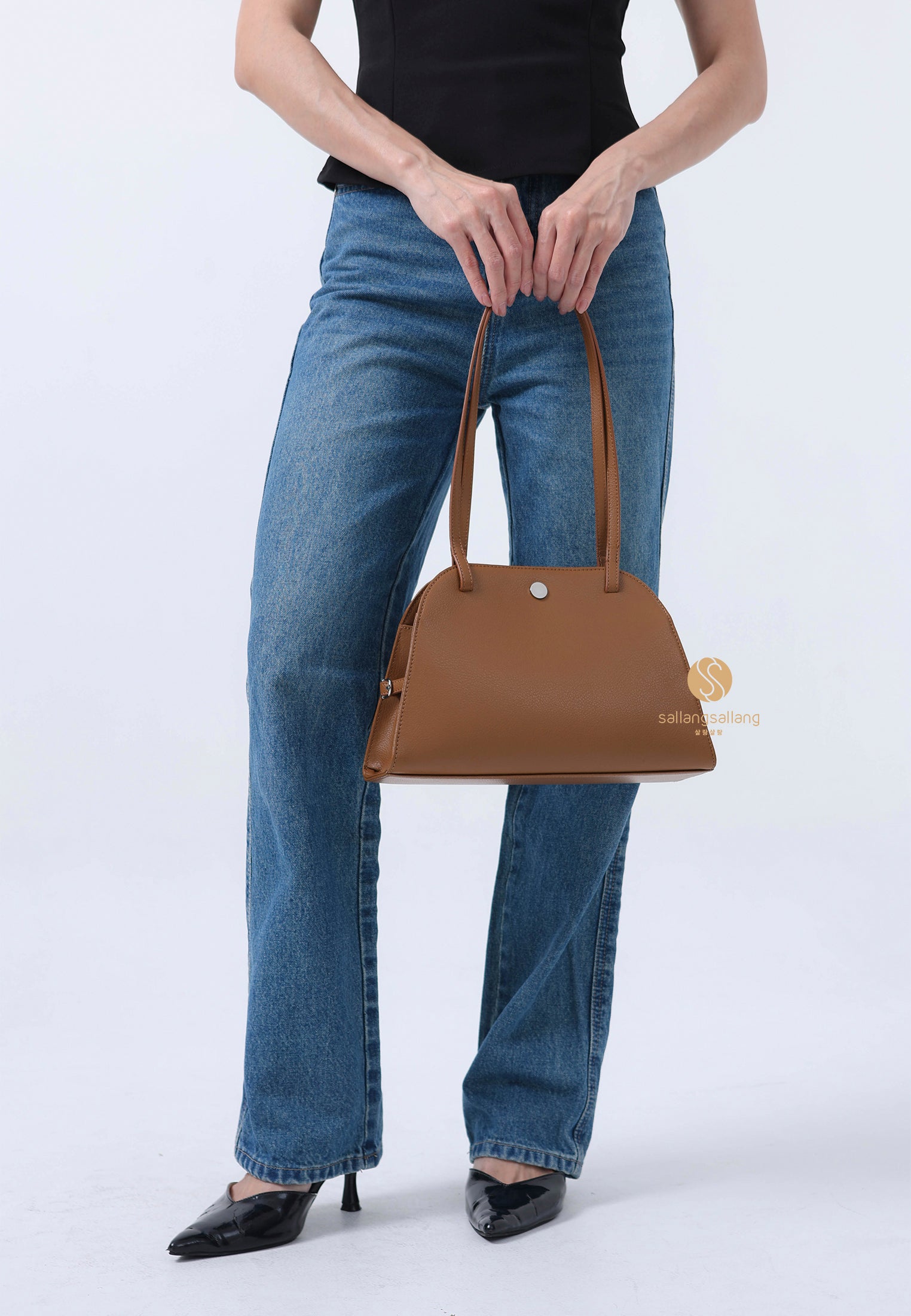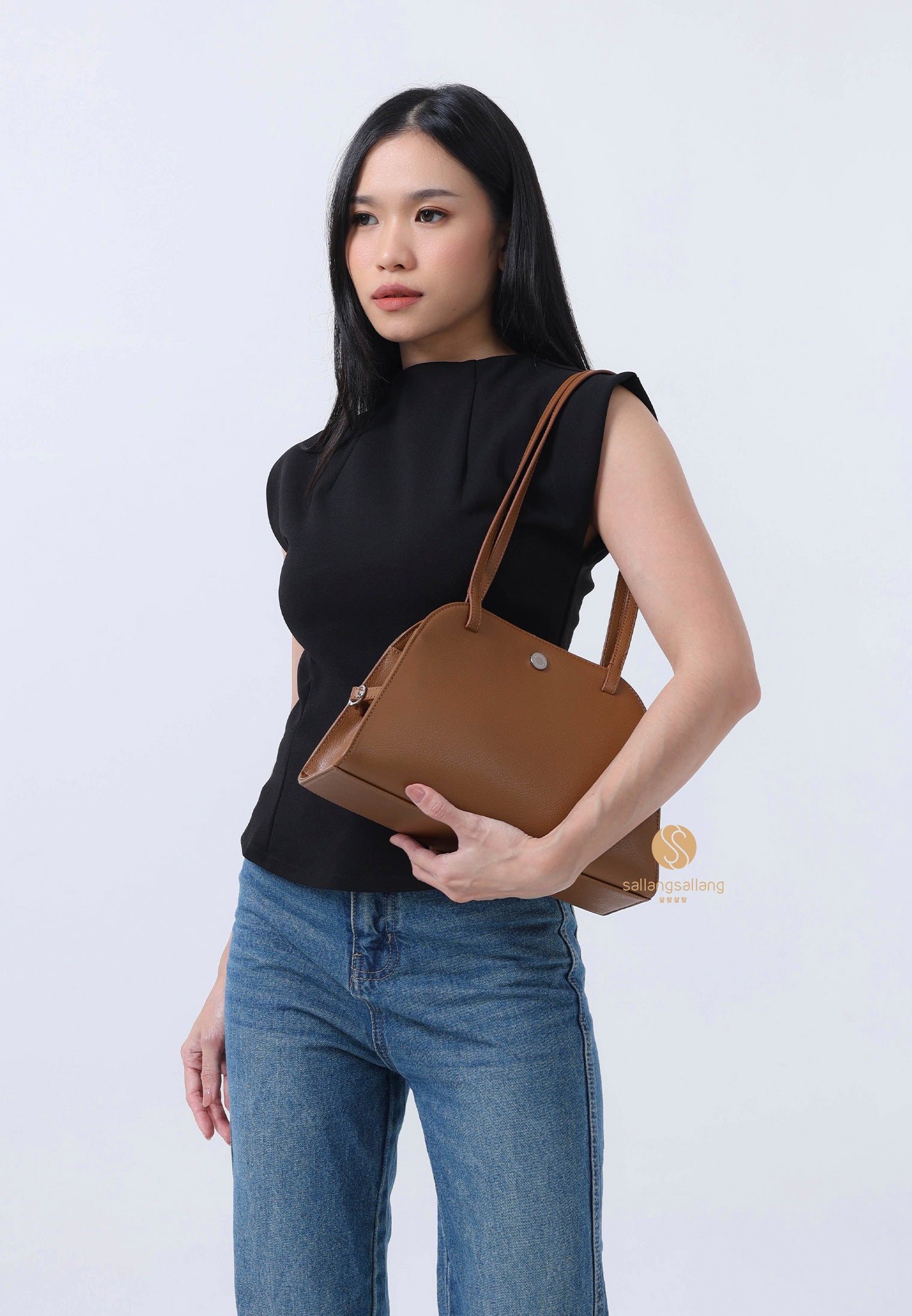 This is a sophisticated shoulder bag with a harmonious blend of soft curves and straight lines. Its basic design, combined with a comfortably long strap, enhances wearability, while minimal metal accents complete a sleek, polished look. The magnetic closure allows for easy and neat opening and closing, making it highly practical for everyday use.