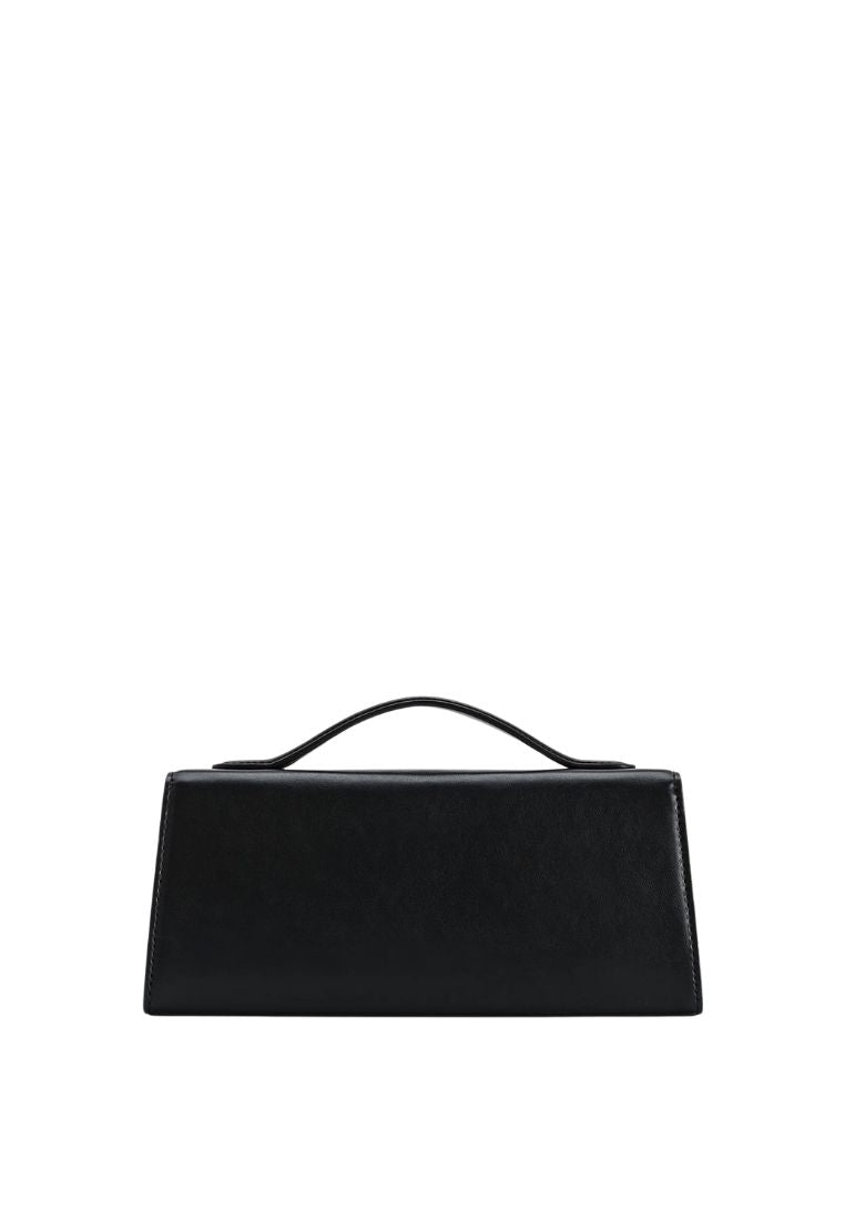 This bag features vegan leather with a smooth finish. It has a gold-tone knotted bar detail on the flap. It includes a top handle and an adjustable strap for versatile wear. The interior holds a phone and small essentials.