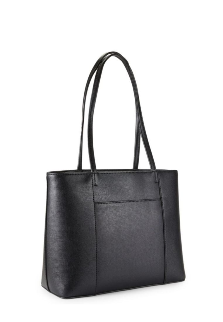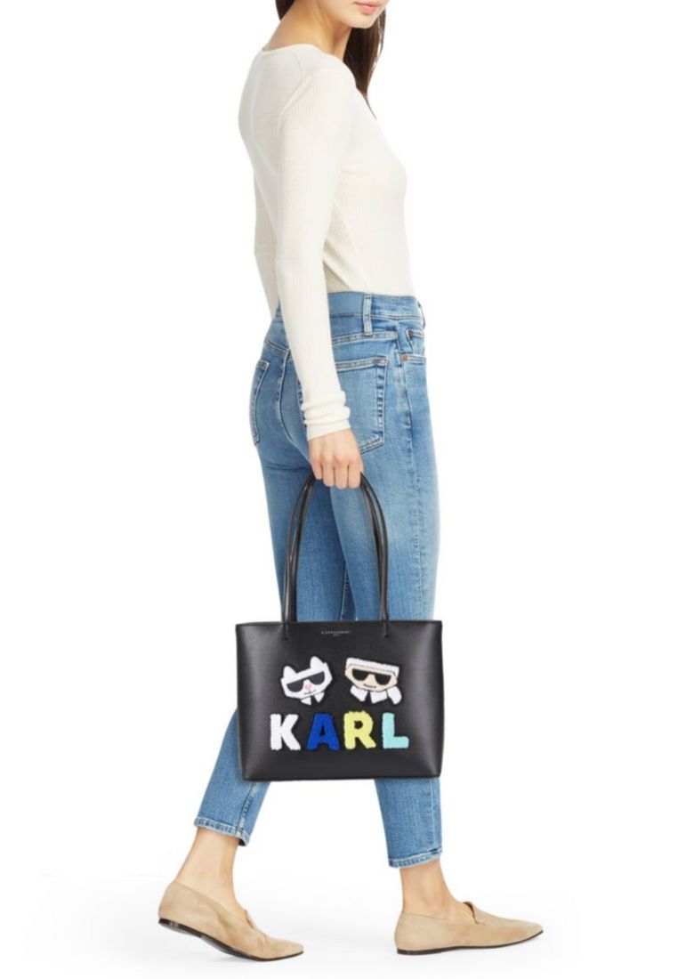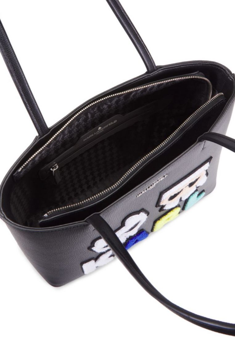 Chenille patches in the shape of Karl and Choupette lend a playful look to this tote.