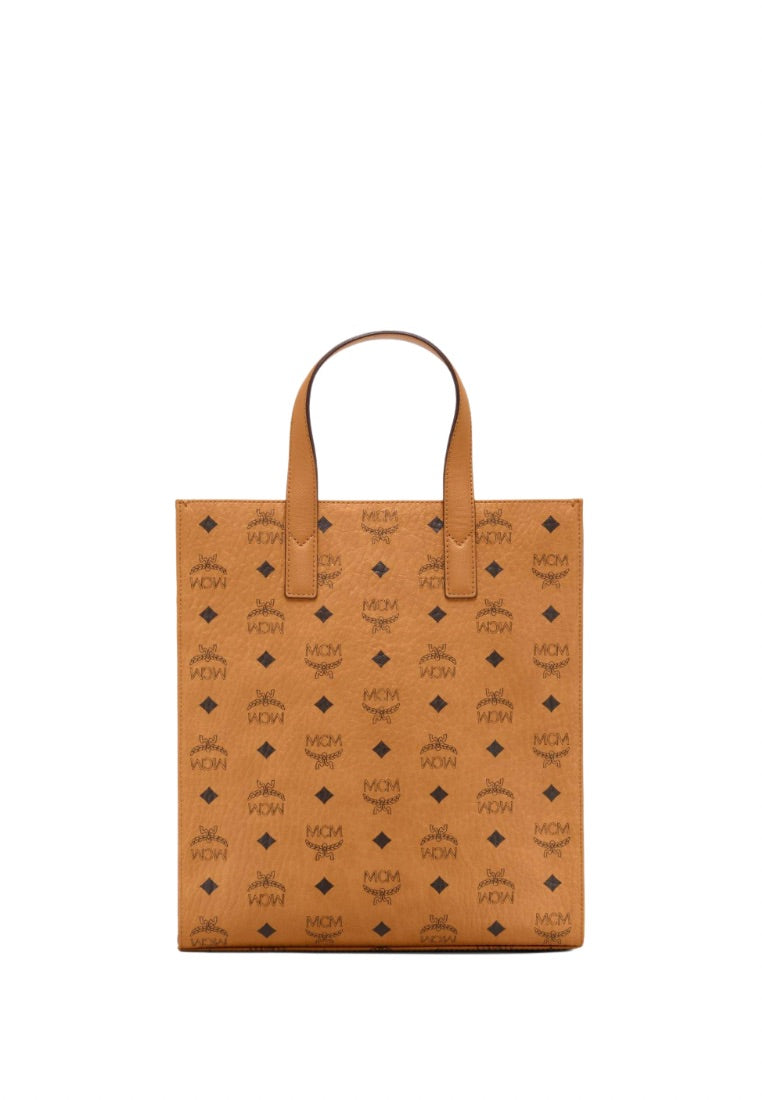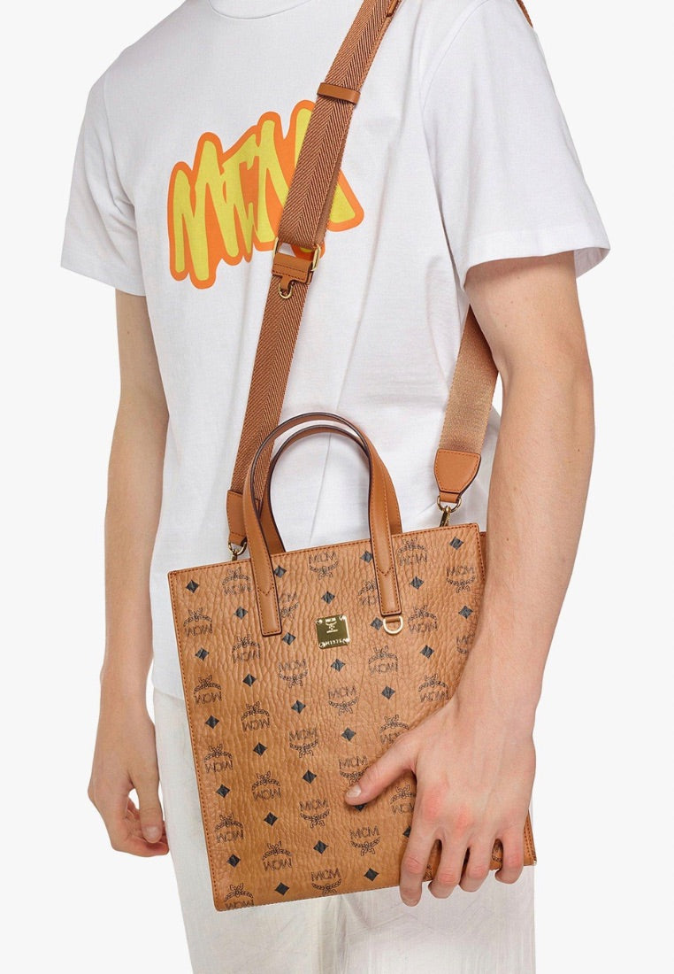 this refined rectangular tote unites classic MCM aesthetics with real-world functionality.
