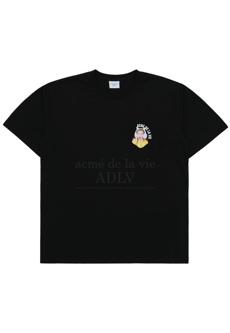 Mini Baby Face Cat Earplug Short Sleeve T-Shirt Black