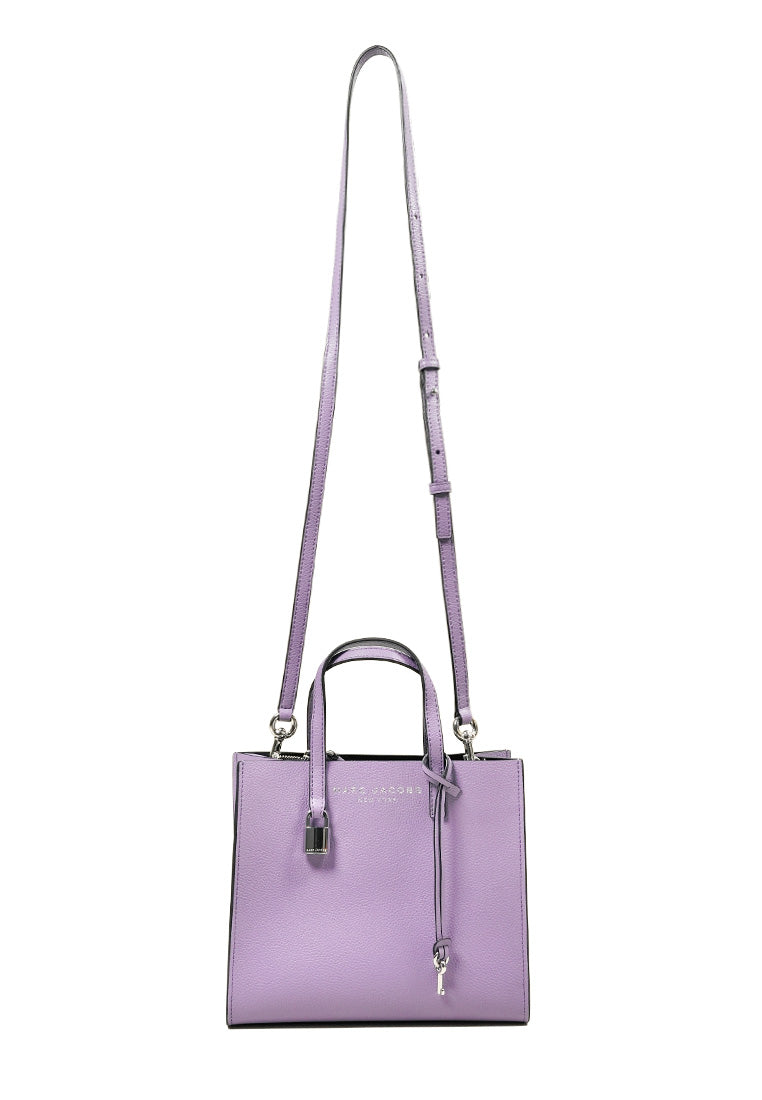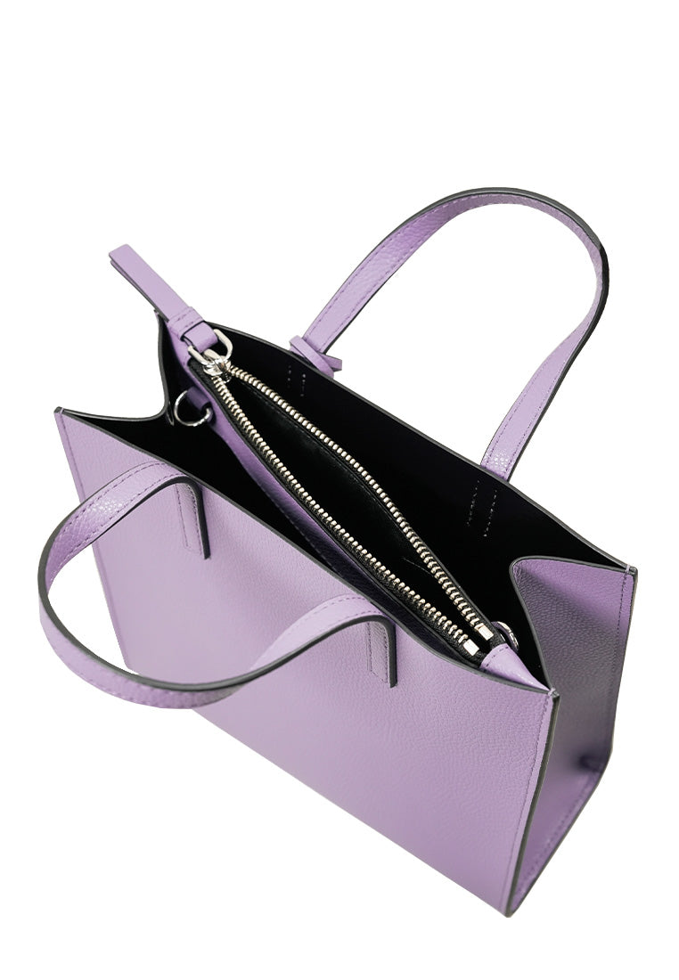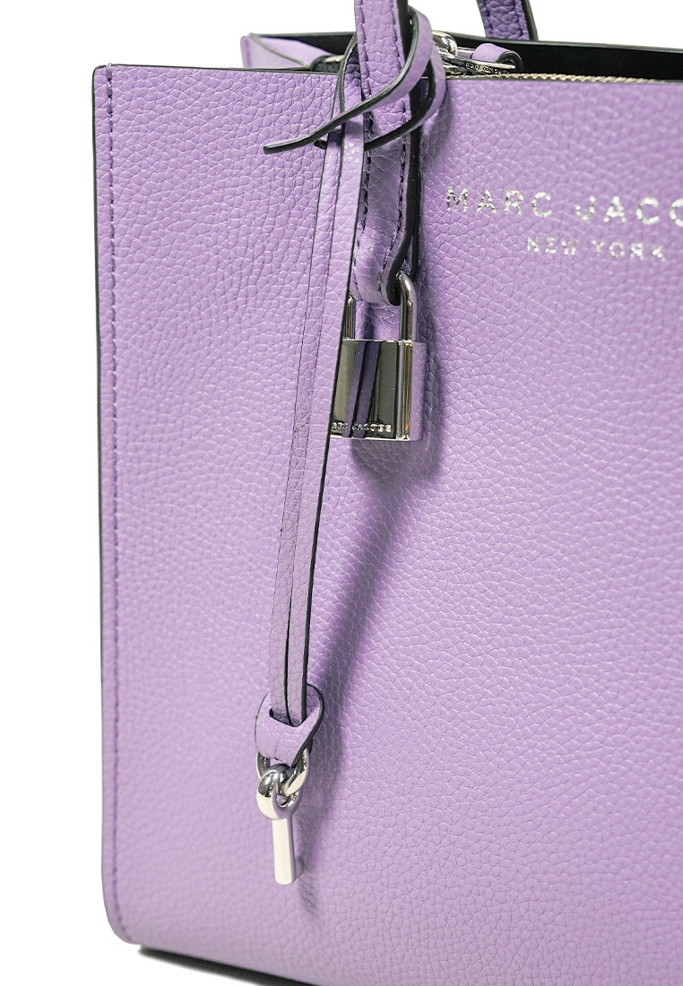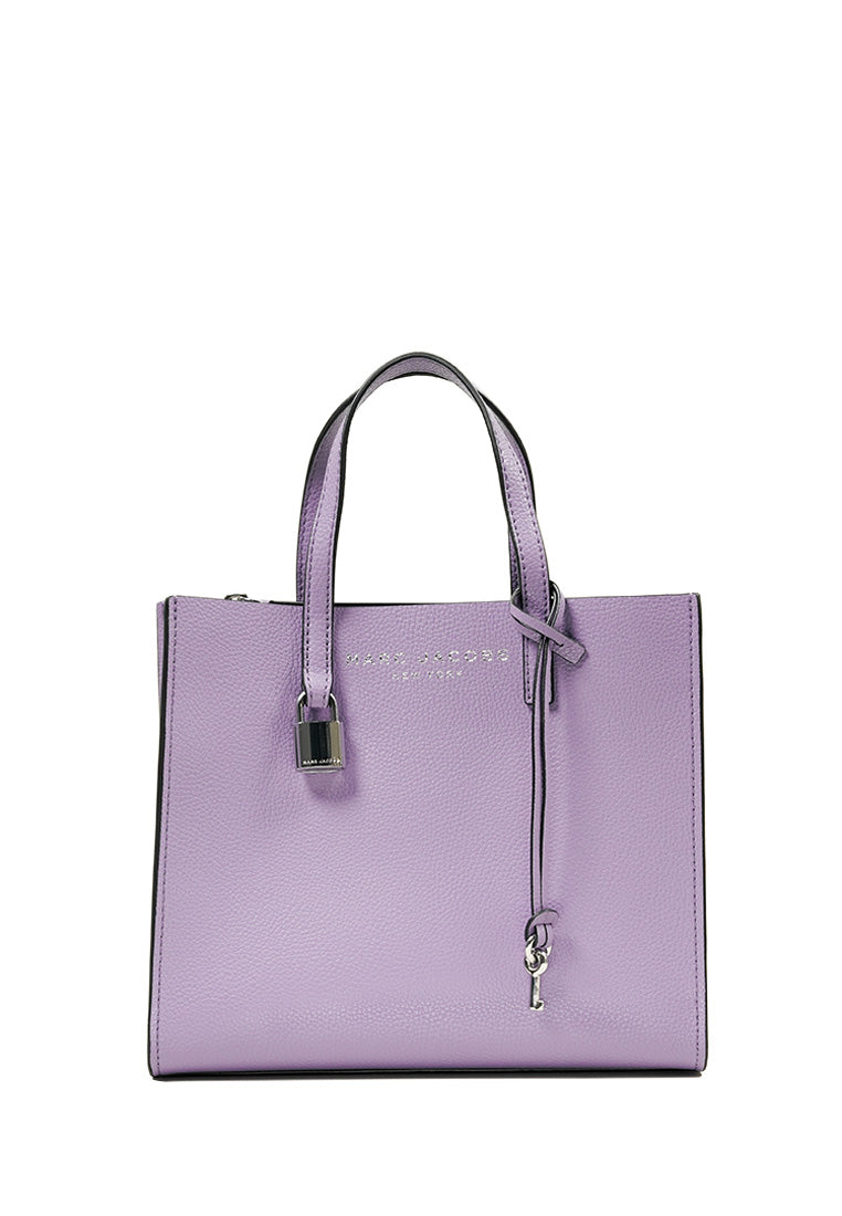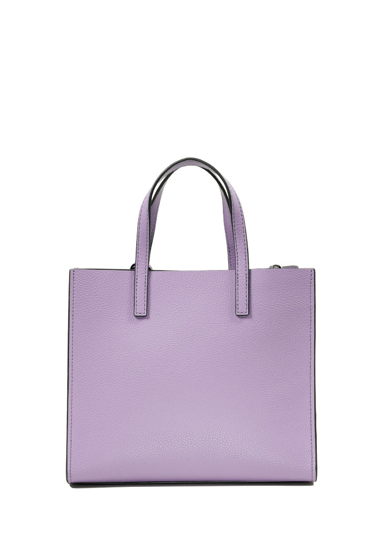 - Lock and key charms adorn a coated leather tote with asymmetrical inner compartments and a center zip pocket.