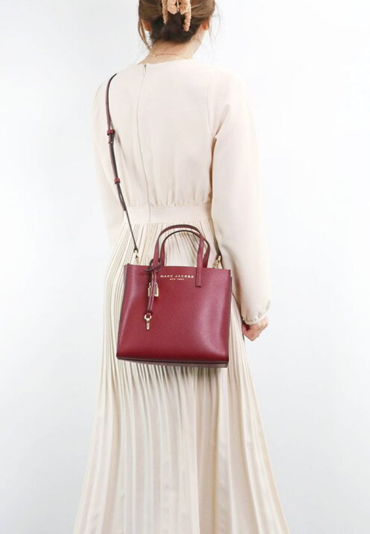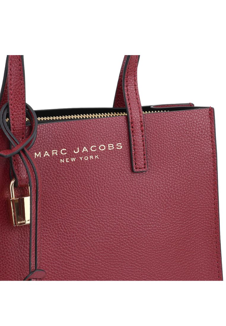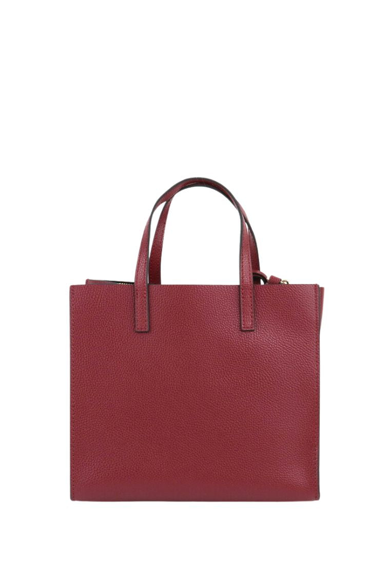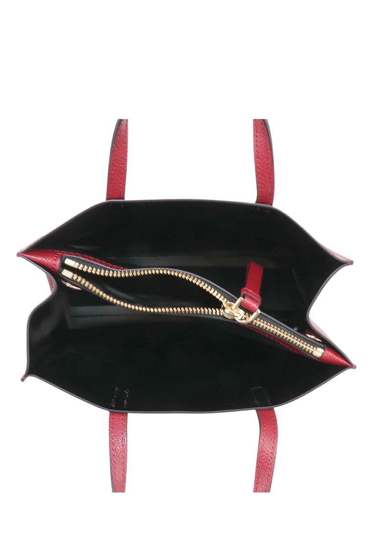 - Lock and key charms adorn a coated leather tote with asymmetrical inner compartments and a center zip pocket.