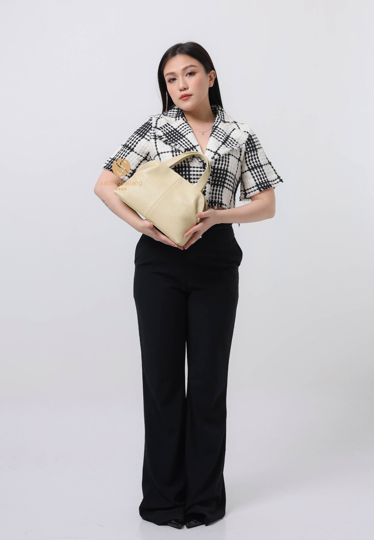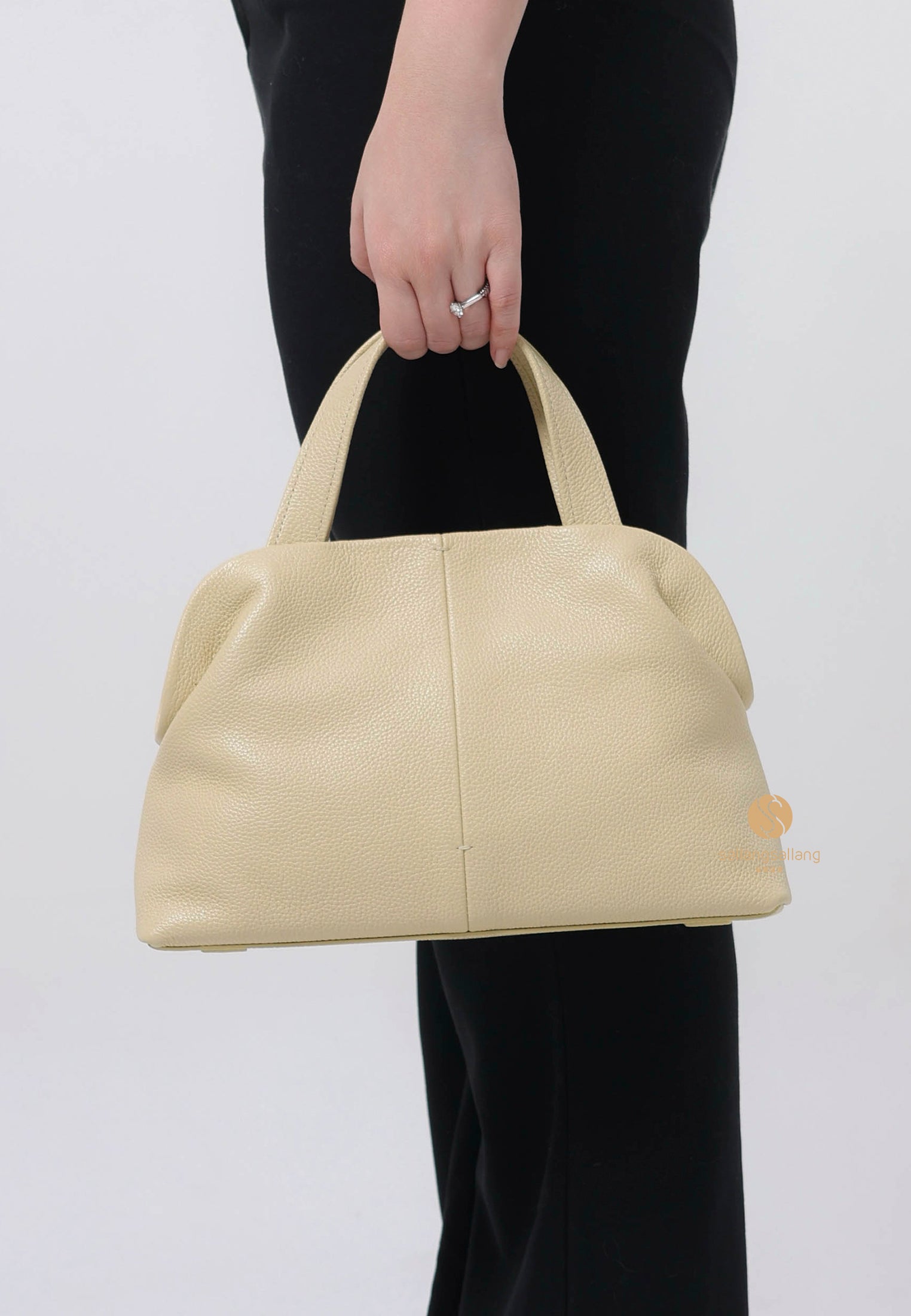 It's a Pave petit bag with a unique and luxurious volume by folding the sides. Soft yet sturdy, natural embossed cowhide is used to create a stylish shape that is slashed casually. It can be opened and closed comfortably with magnets and has two pockets inside. The pave bag can be worn as a tote bag.