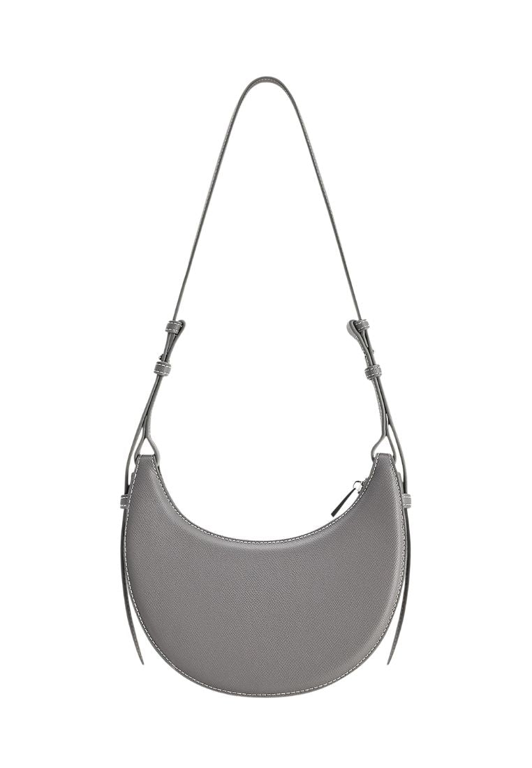 This shoulder bag features a crescent silhouette with textured vegan leather. It has a slip pocket interior and silver-tone hardware. The adjustable strap allows for comfortable shoulder or crossbody wear.
