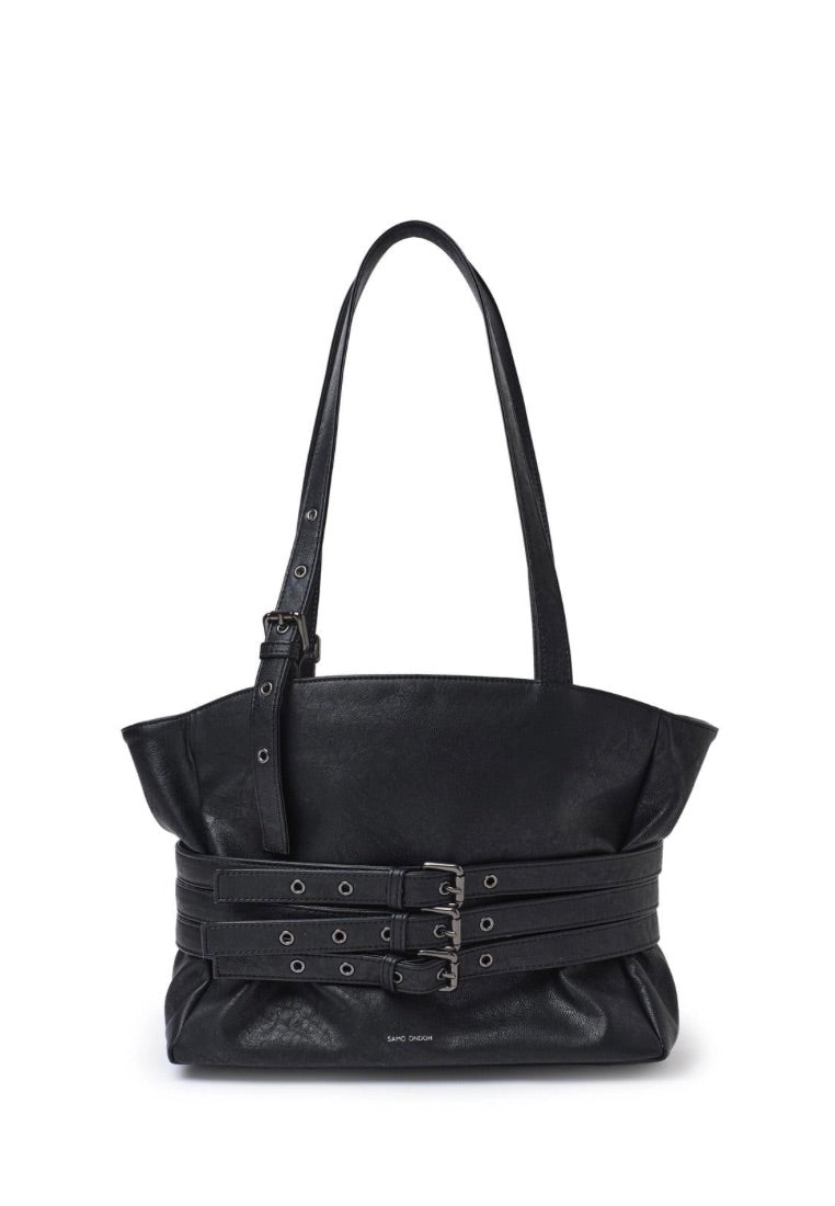 This is a belted corset bag that can be styled freely with three belt straps coming from the back.