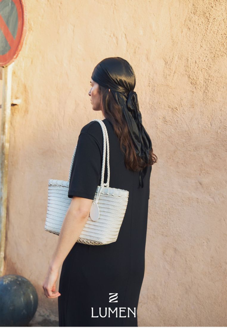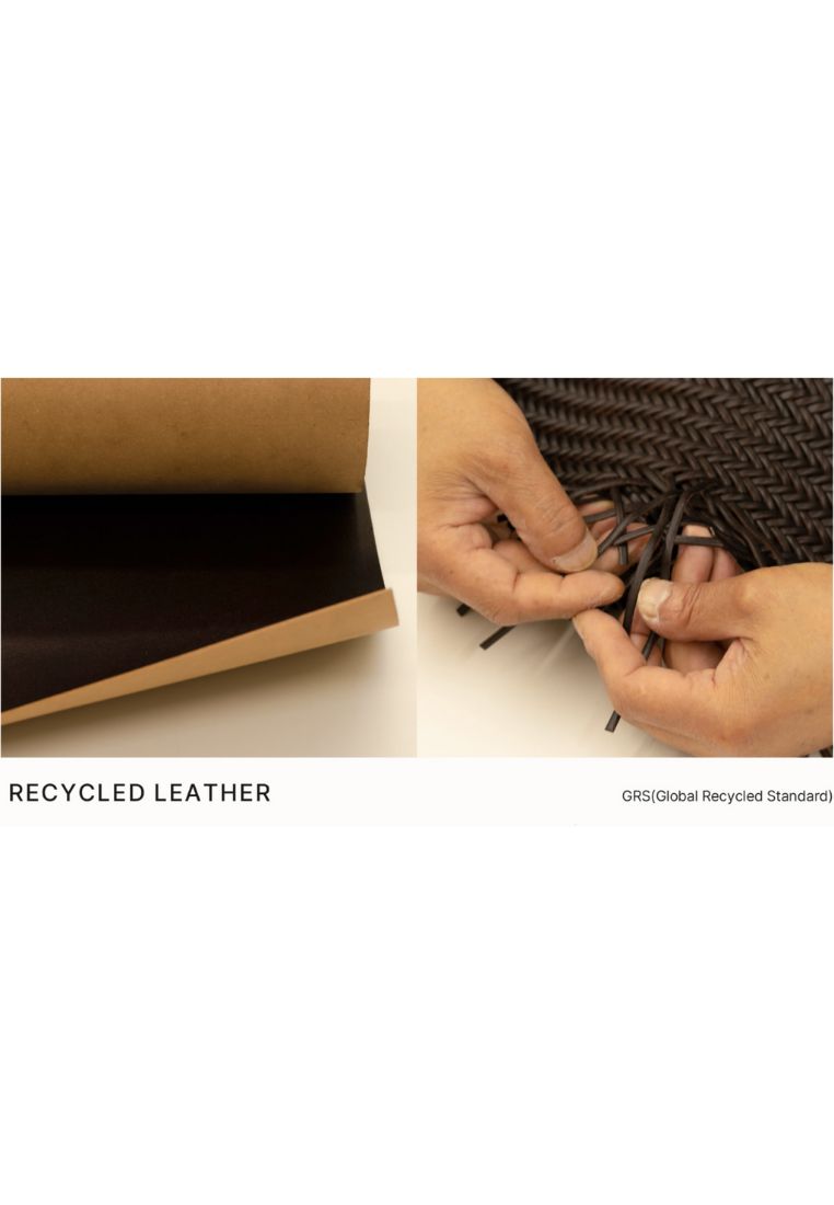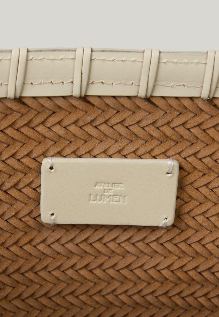 This is a Twig bag, woven strand by strand by hand. The intricately woven Twig bag is made of eco-friendly recycled leather that has been reprocessed from discarded leather. The Twig bag is a shoulder bag with a shape that is easy to store and is lightweight, making it comfortable to use. The belt detail is a focal point, and the Lumen illustration logo engraved on the hanging charm adds to the value of handcraft.