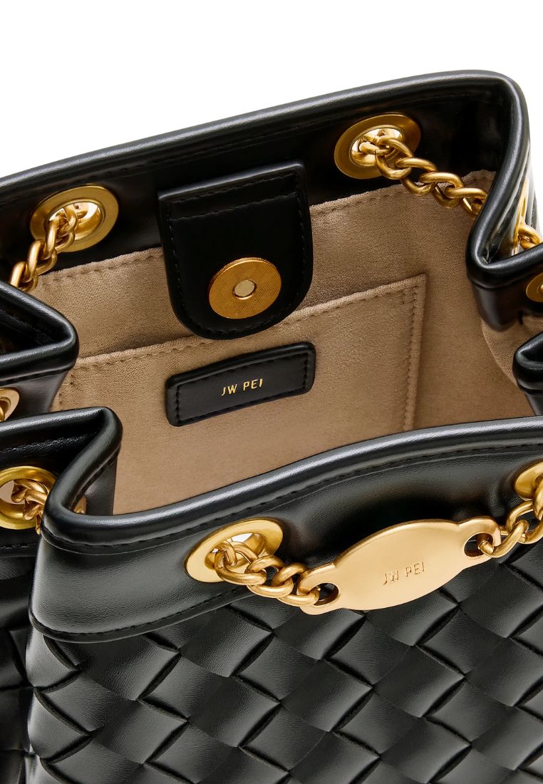 This bag features a hand-woven black design, accented with a luxurious gold-tone chain and hardware for a blend of classic elegance and modern style. The bucket shape offers a practical yet refined look, making it perfect for both daily use and elevated occasions.